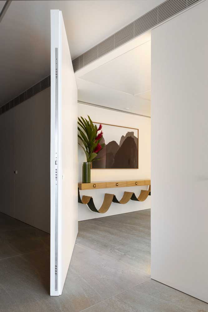 O aparador suspenso garante um visual mais clean para o hall, ao mesmo tempo em que traz sensação de amplitude.