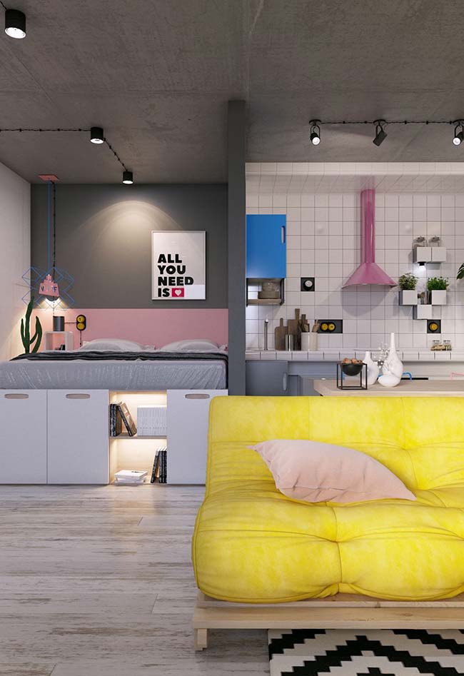 A cor cinza predomina nesse apartamento pequeno e todo integrado. Para criar contraste um pouco de amarelo e rosa. A parede de tijolinhos branca e o teto de cimento queimado realçam a proposta moderna do imóvel.
