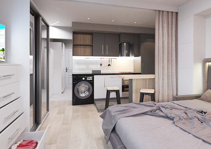 Esse apartamento reduzido teve como solução integrar as bancadas da cozinha, área de serviço e banheiro, criando uma única área molhada na casa. O closet vem logo ao lado da cozinha, fechado por uma cortina. O chão, no entanto, permanece livre, aumentando a área útil de circulação.