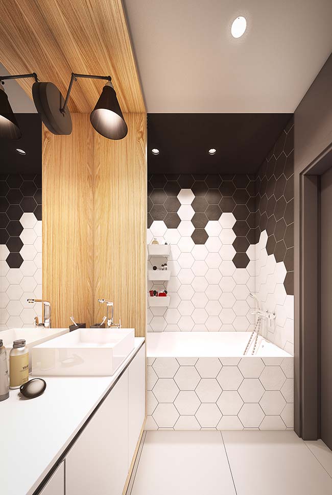 Imagem 41 – Decoração meia a meia: branco e preto se dividem no revestimento da parede.