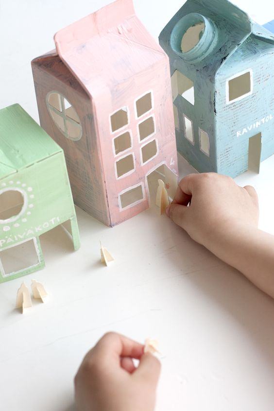 Imagem 24 – Pequenas casas estampadas feitas com caixas de leite.