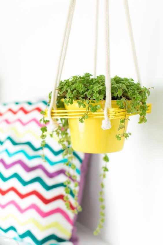 Imagem 19 – Suporte para vaso suspenso feito com barbante e palitos de picolé amarelos.