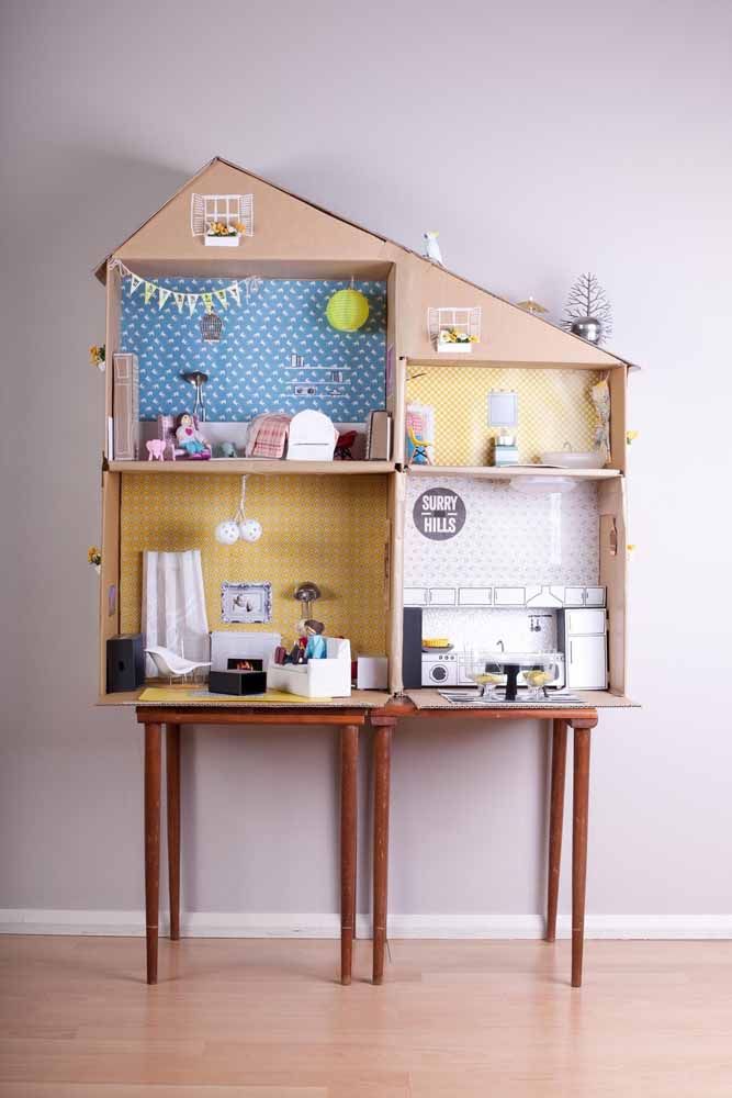 Imagem 9 – Artesanato com papelão: Quem precisa de brinquedos caros? Essa casinha de papelão é uma graça e coloca a imaginação da criançada para trabalhar.