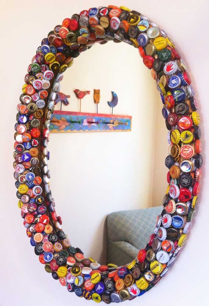 Imagem 8 – Artesanato com tampinhas de metal. Juntas elas formam uma moldura colorida e criativa para o espelho.