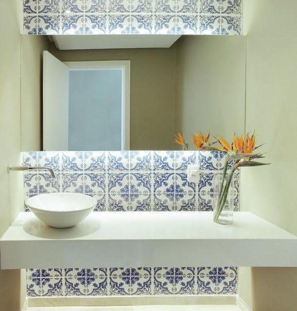 Por ser pequeno, a solução foi colocar um banquinho mais baixo para compor com a bancada desse banheiro. Essa ideia também é ideal para aqueles que desejam uma mudança simples e rápida no banheiro.
