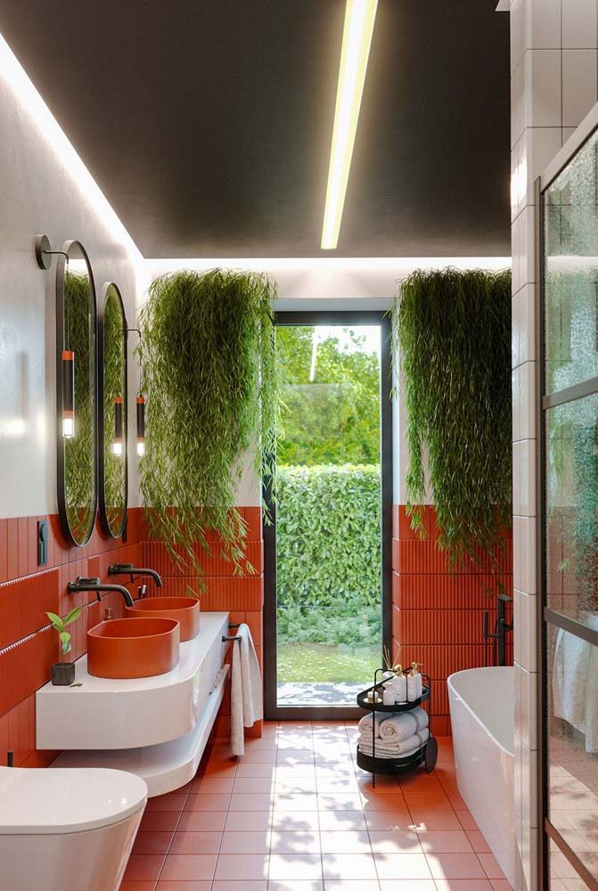 Você também vai precisar de uma paleta de cores incrível para o seu projeto. E, ao contrário dos banheiros pequenos, onde o aconselhável é usar cores claras para trazer a sensação de amplitude, nos banheiros grandes esse cuidado não é necessário.
