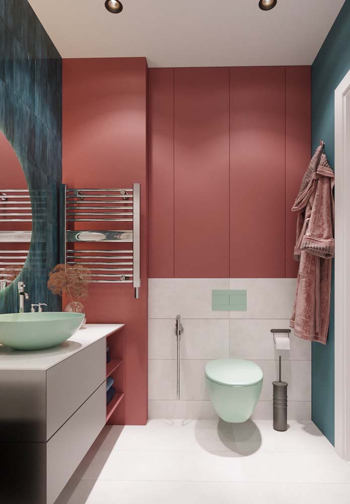 Imagem 34 – Banheiro colorido com pintura na cor vinho e verde claro nas louças.