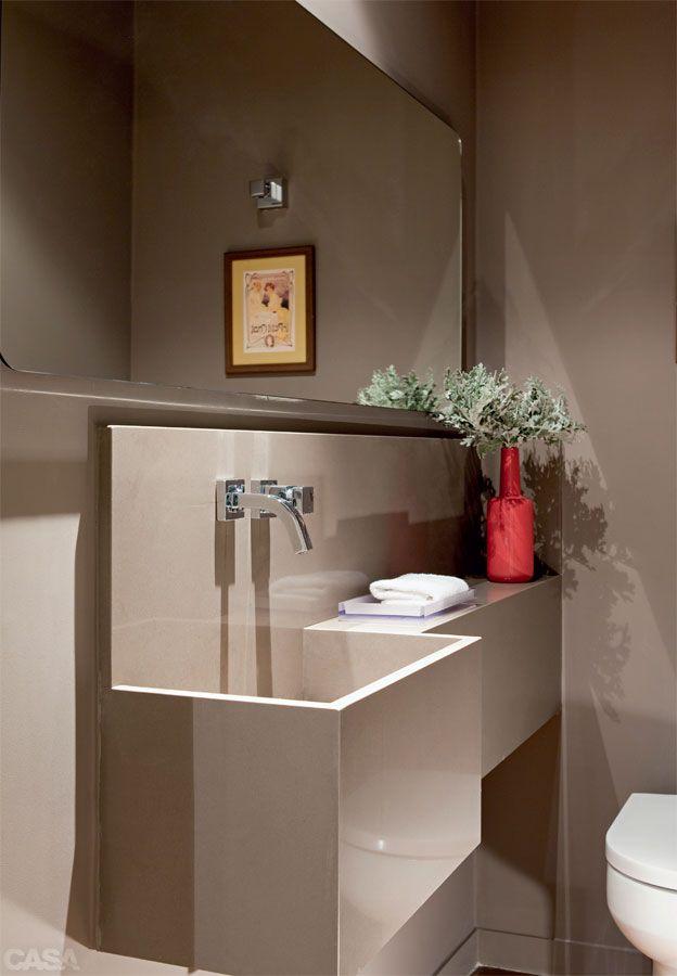Imagem 48 – Linda ideia de cuba minimalista com torneira na parede lateral, sem interferir no espelho.