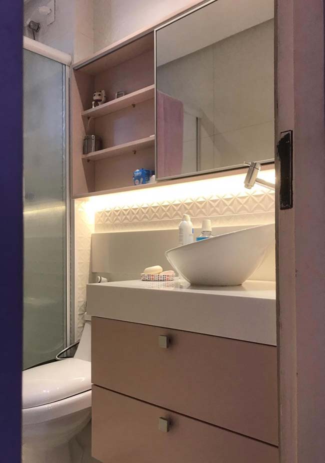 Imagem 20 – Banheiros pequenos decorados: os ladrilhos rosa e bege foram utilizados em apenas uma parede.