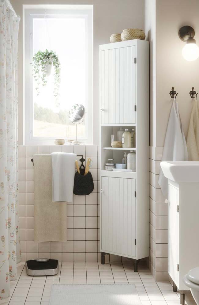 Os armários de banheiro devem ser proporcionais ao tamanho do banheiro. Nada de gabinetes enormes para ficar atrapalhando a movimentação. Opte por modelos mais compactos abaixo da pia. Ou simplesmente, elimine-os da decoração e o substitua por prateleiras e outros tipos de organizadores.