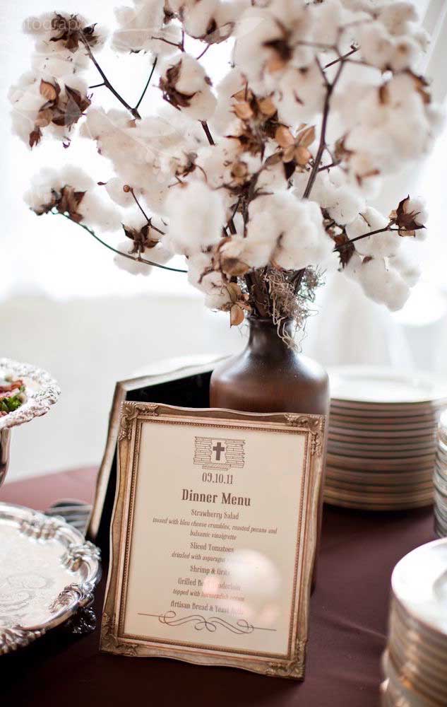 Imagem 34 – Arranjo rústico feito com ramos de algodão decorando a mesa de jantar das Bodas.