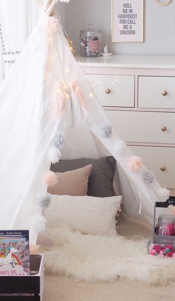 Imagem 8 – Almofadas, luzes e pompons coloridos deixam a cabana infantil ainda mais receptiva e confortável .