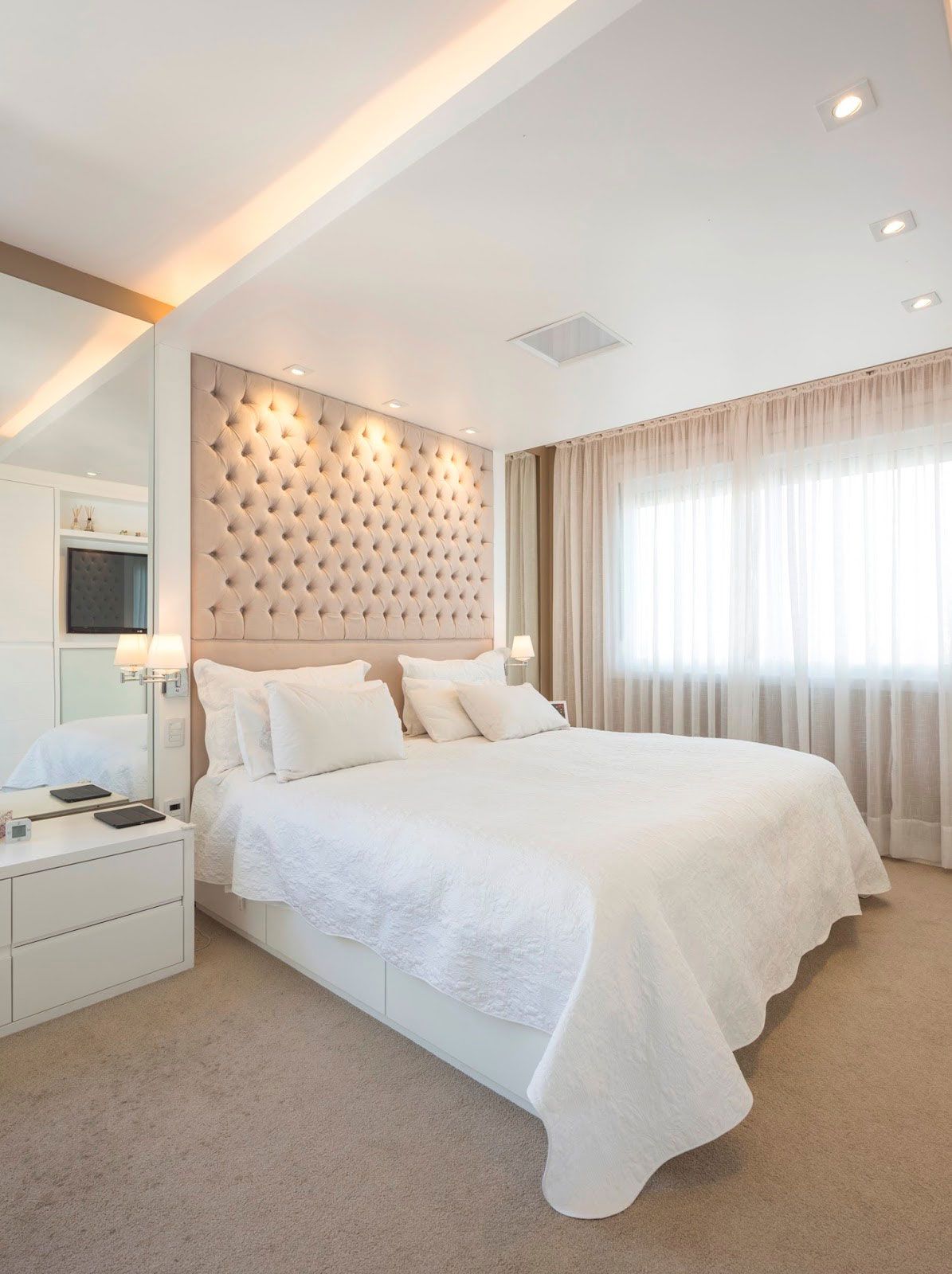 Se o teto for alto, você pode investir em uma cabeceira grande sem medo. Porém se for um teto mais baixo, deixe esta proposta de lado, para que o ambiente não fique com o aspecto visual menor do que realmente é.