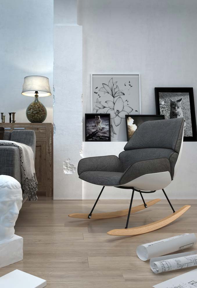 Imagem 35 – Outro modelo de cadeira de balanço num desenho mais contemporâneo para uma decoração mais mininal.