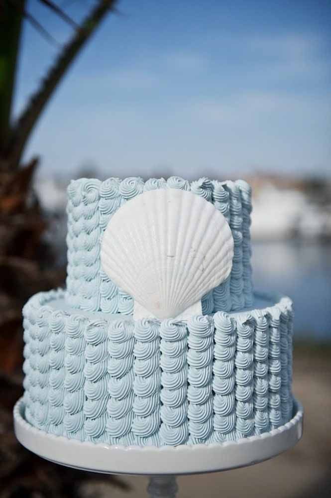 Imagem 64 – Bolo azul decorado com concha: a cara de um casamento na praia.