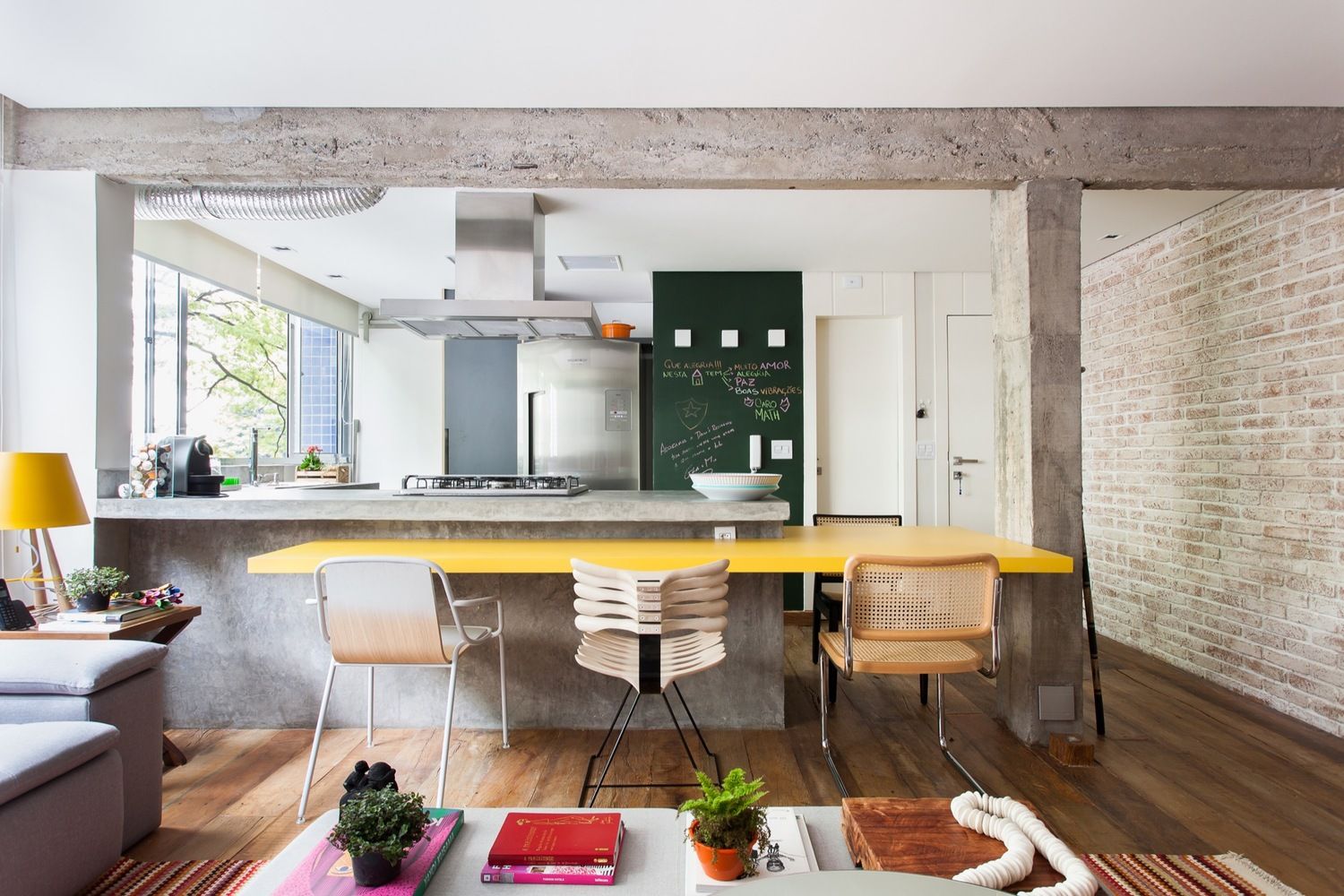 O estilo industrial pede elementos marcantes como os tijolinhos, o concreto, o couro e as tubulações aparentes.
