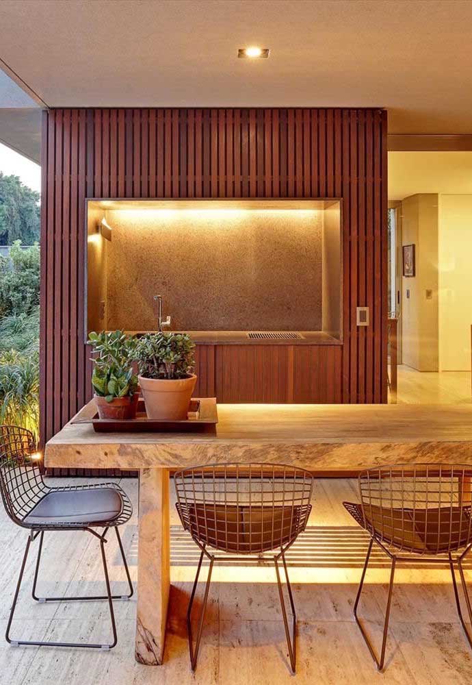 51. Um ambiente lindo e rústico, perfeito para receber os amigos para o churrasco feito na churrasqueira elétrica super estilosa sob o balcão.