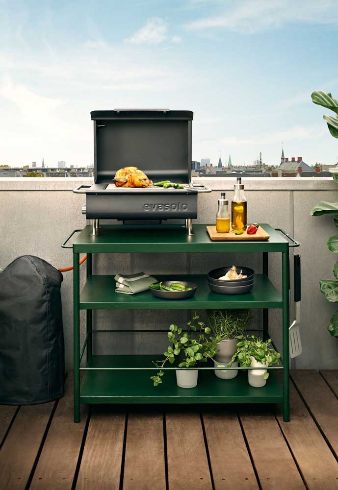 14. O terraço do apartamento ganhou uma churrasqueira elétrica pequena sobre o carrinho de metal.