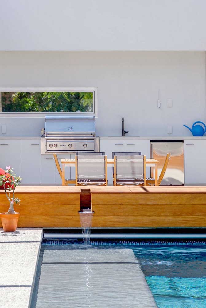 44. A área próxima a piscina ficou completa com a churrasqueira elétrica embutida.