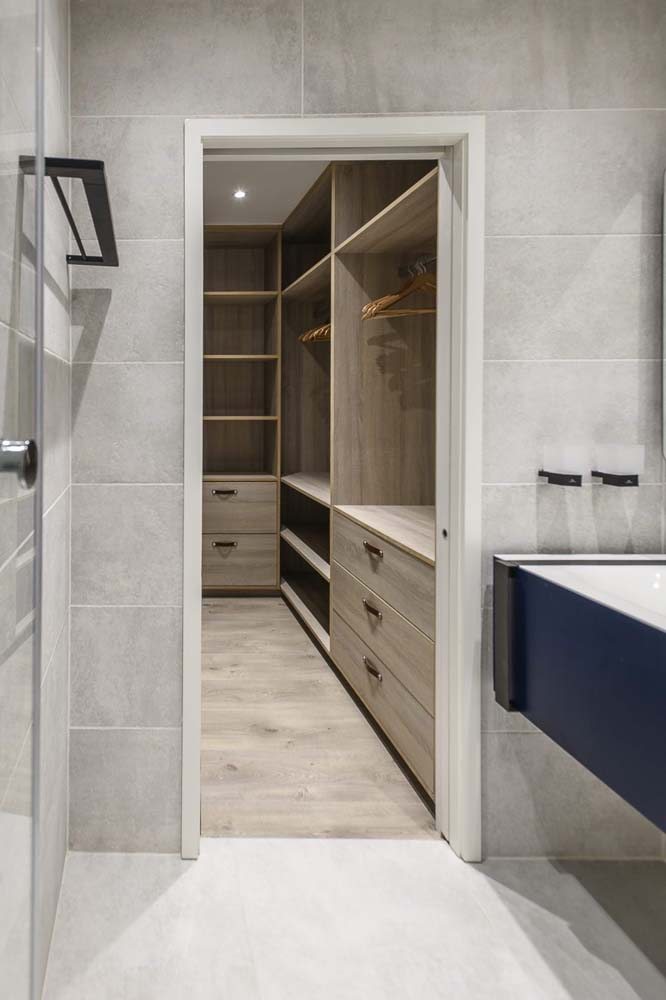 Imagem 29 – Projeto minimalista para o closet com banheiro integrado.