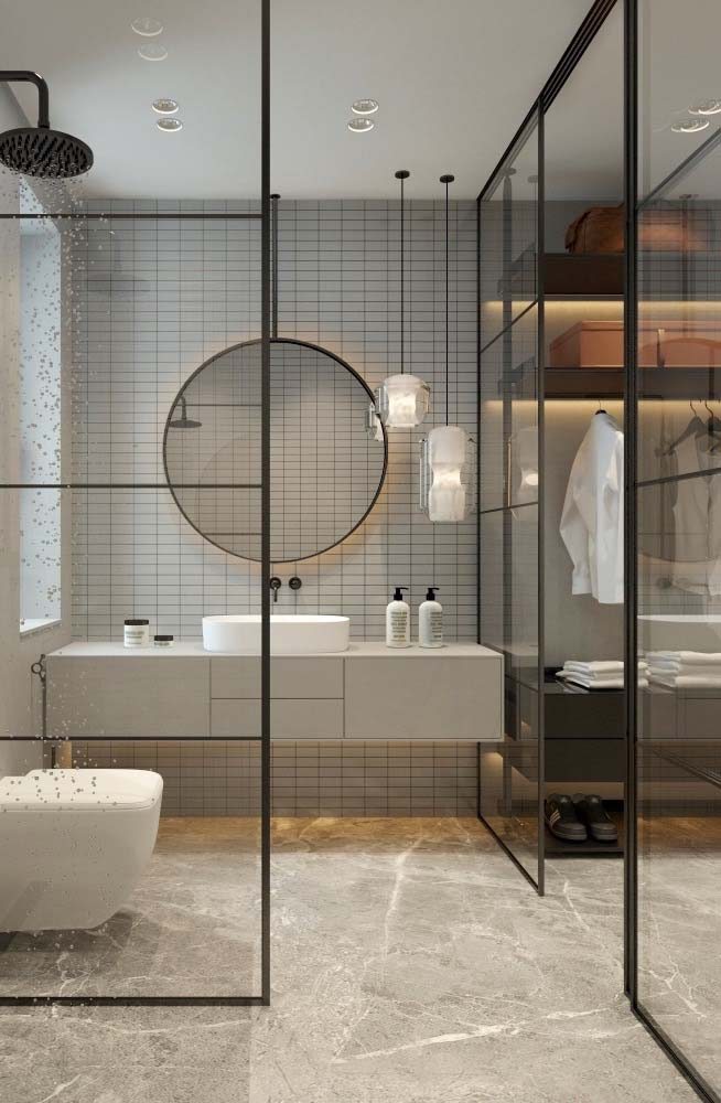 Imagem 1 – Tons de cinza dão o tom nesse projeto de closet com banheiro integrado.