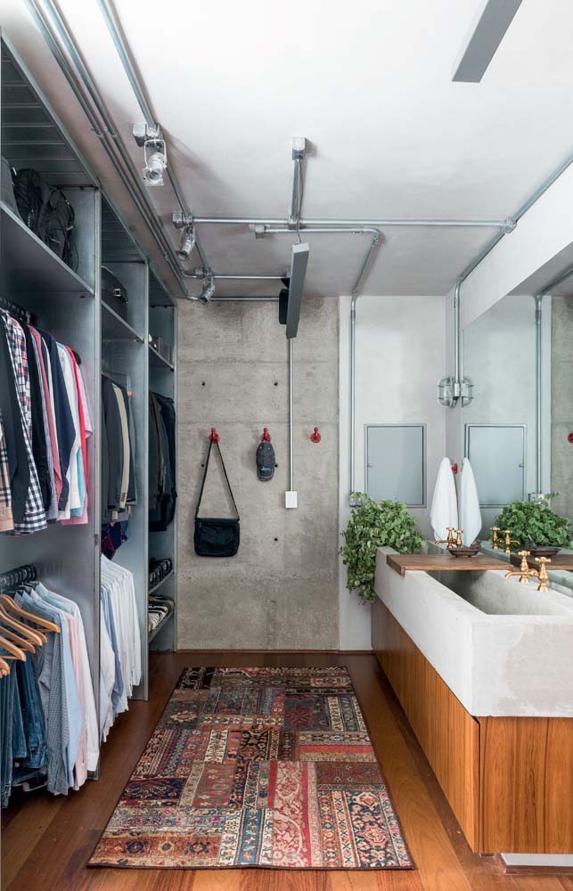 Imagem 31 – Já aqui, a dica é usar cimento queimado para um closet com banheiro simples.