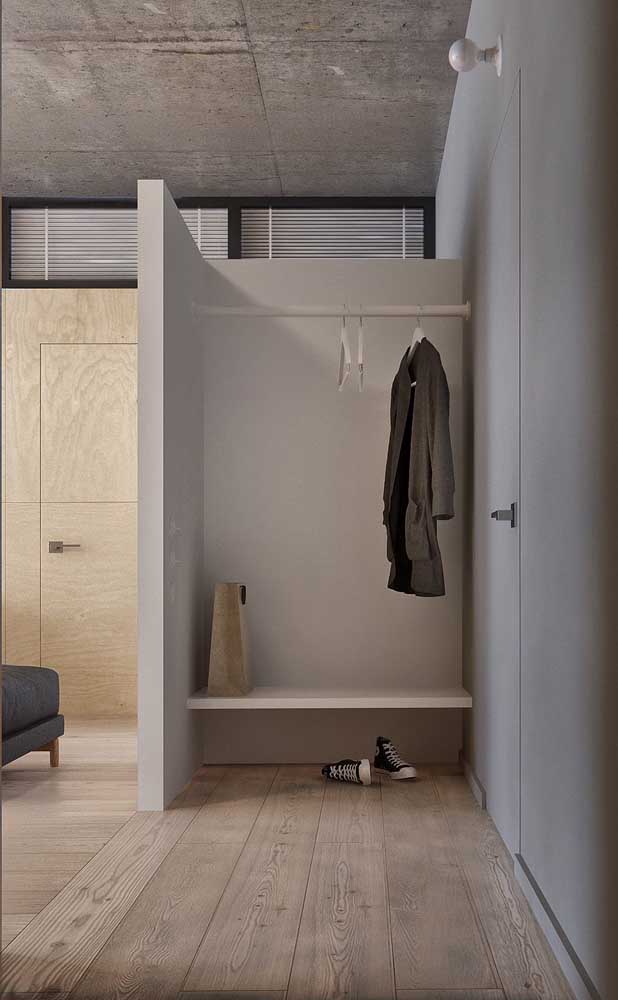 Imagem 57 – Closet pequeno de gesso na entrada do quarto para acomodar as roupas, bolsas e sapatos que acabaram de ser tirados.