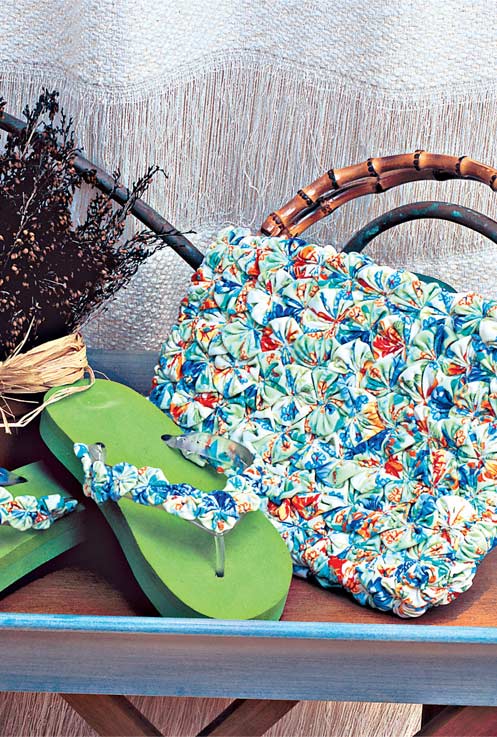 Imagem 2 – Conjunto de praia com bolsa e chinelo elaborados com fuxico.