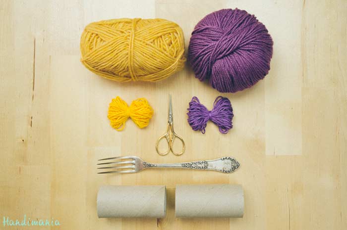 Ideal para pompons maiores, utiliza dois rolos de papel higiênico vazios.
