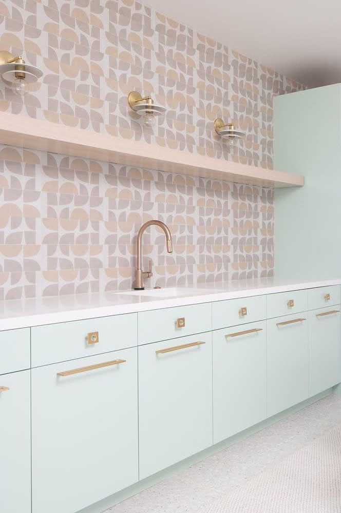 Imagem 23 – Cozinha nude rose e verde menta: duas cores complementares, suaves e delicadas.