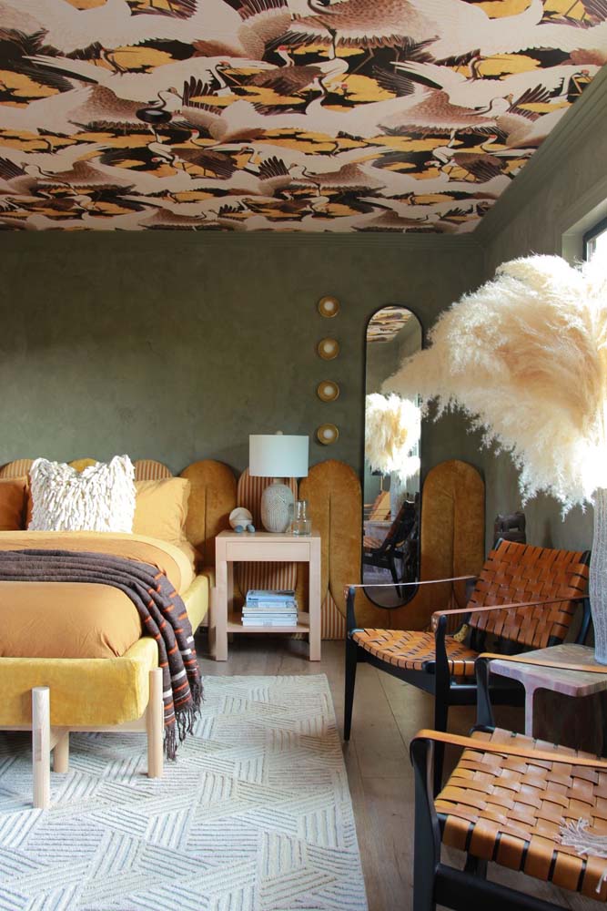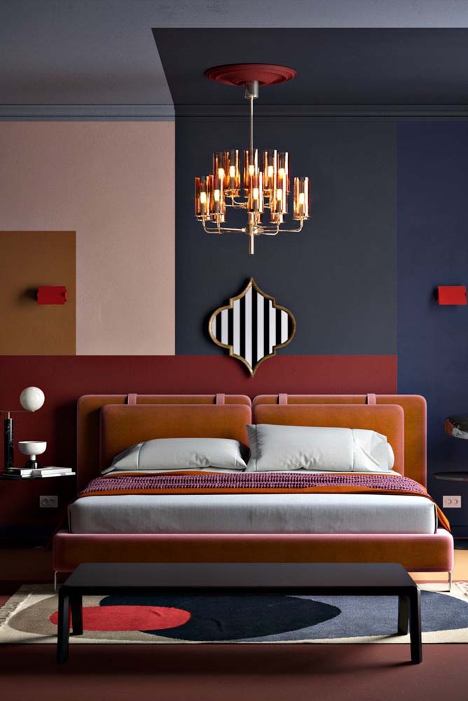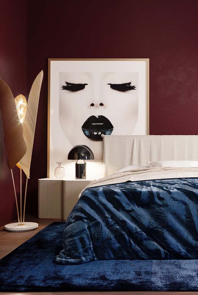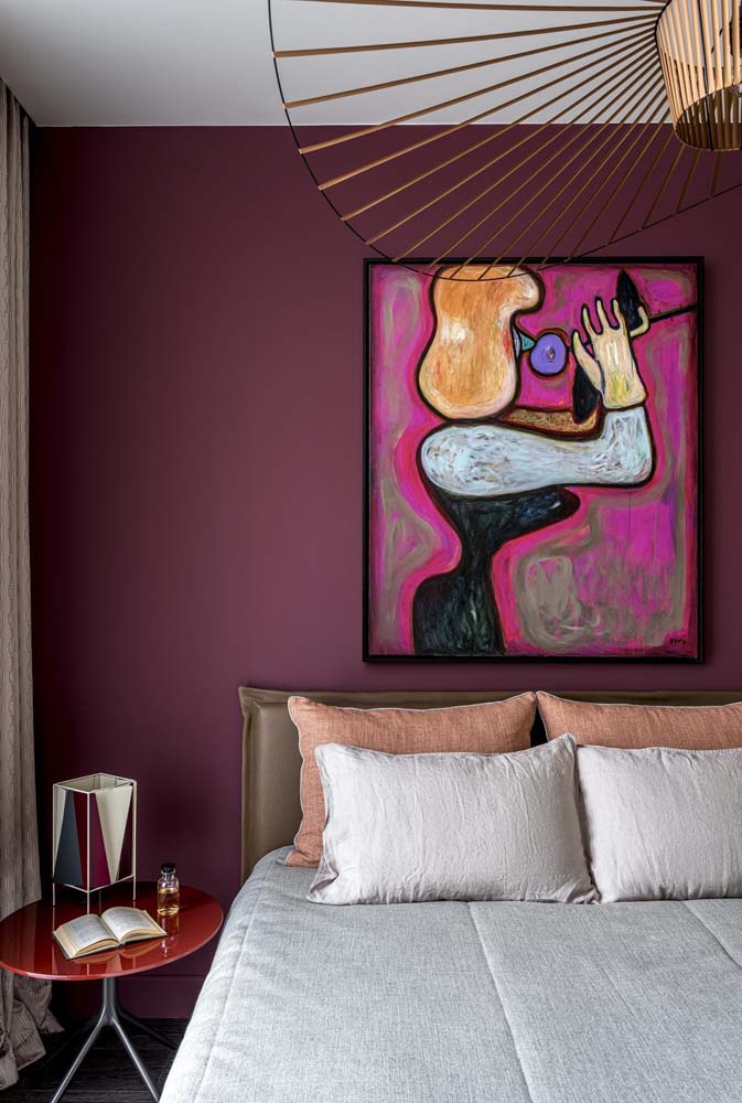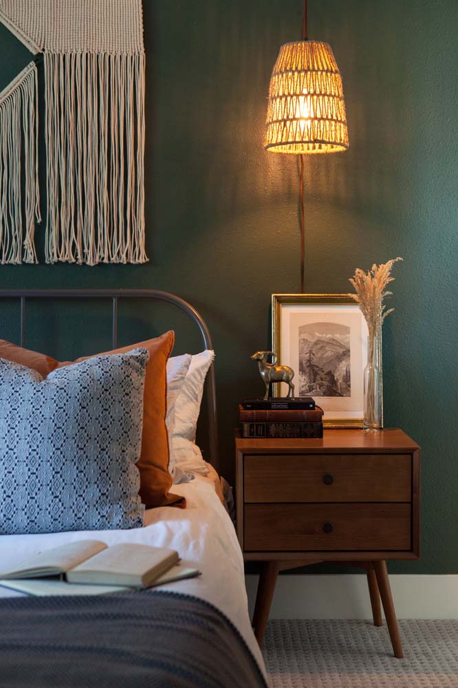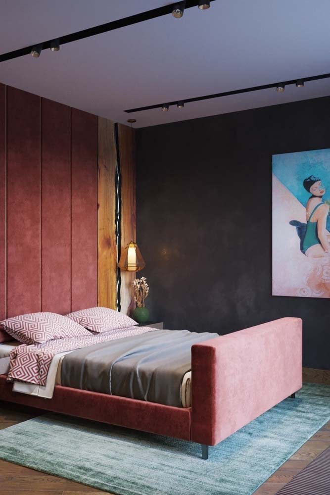 Já uma parede de cor escura no fundo do quarto provoca a sensação de profundidade.