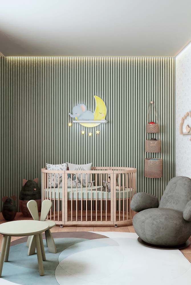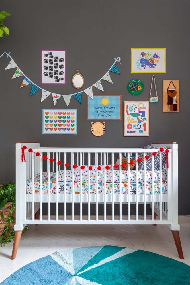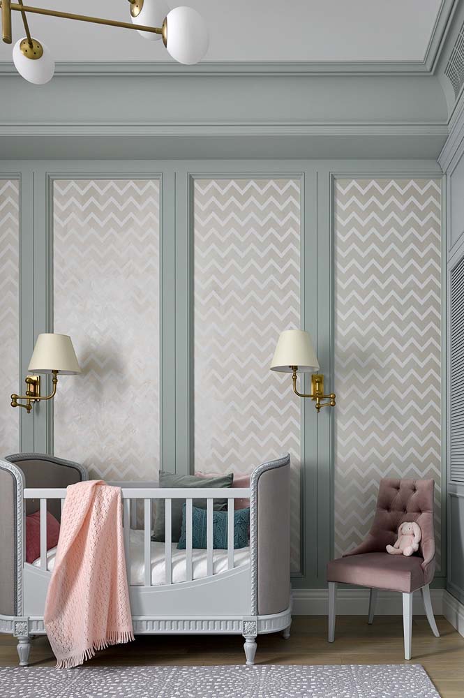 Imagem 45 – Para um quarto de bebê moderno, aposte em uma parede cinza.