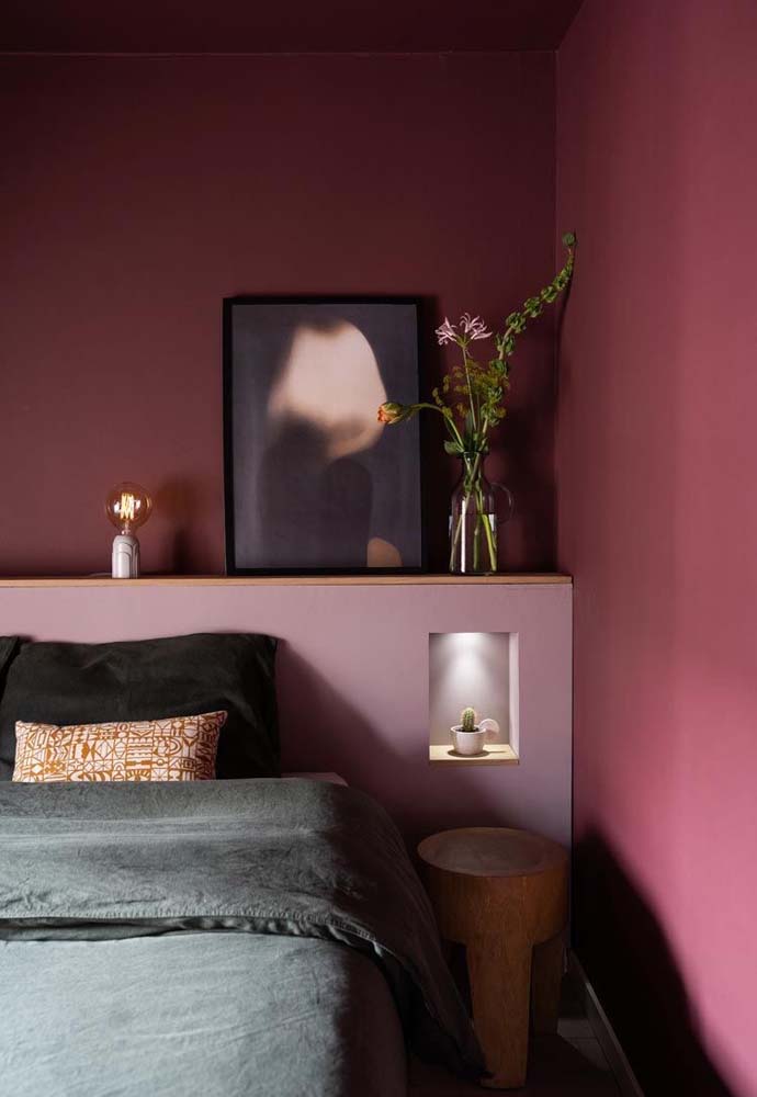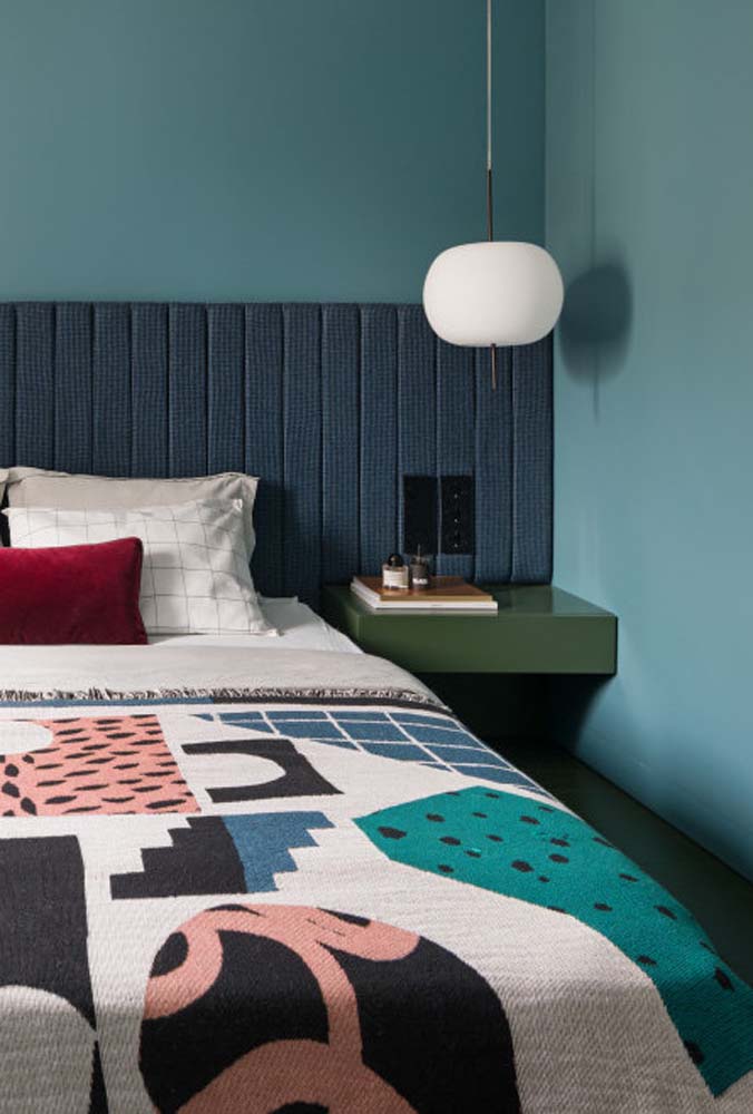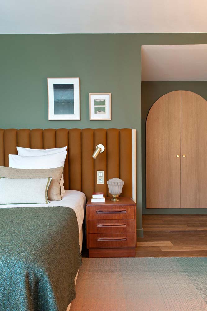 Imagem 28 – Uma bela composição entre a cor de tinta da parede e a cabeceira da cama.