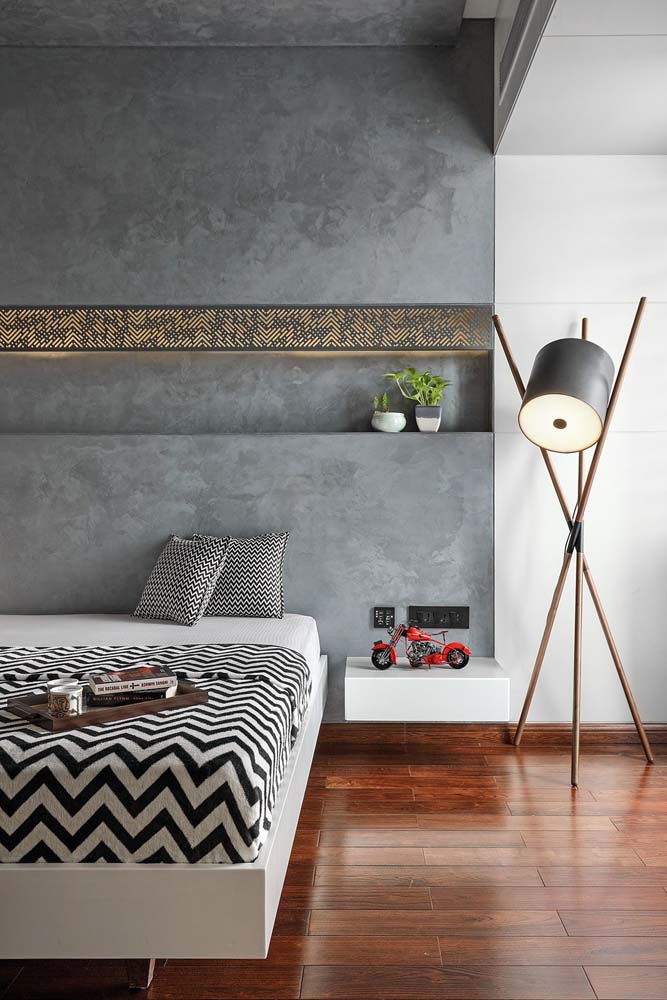 Imagem 27 – Cores de tinta para quarto masculino: cinza com efeito cimento queimado.