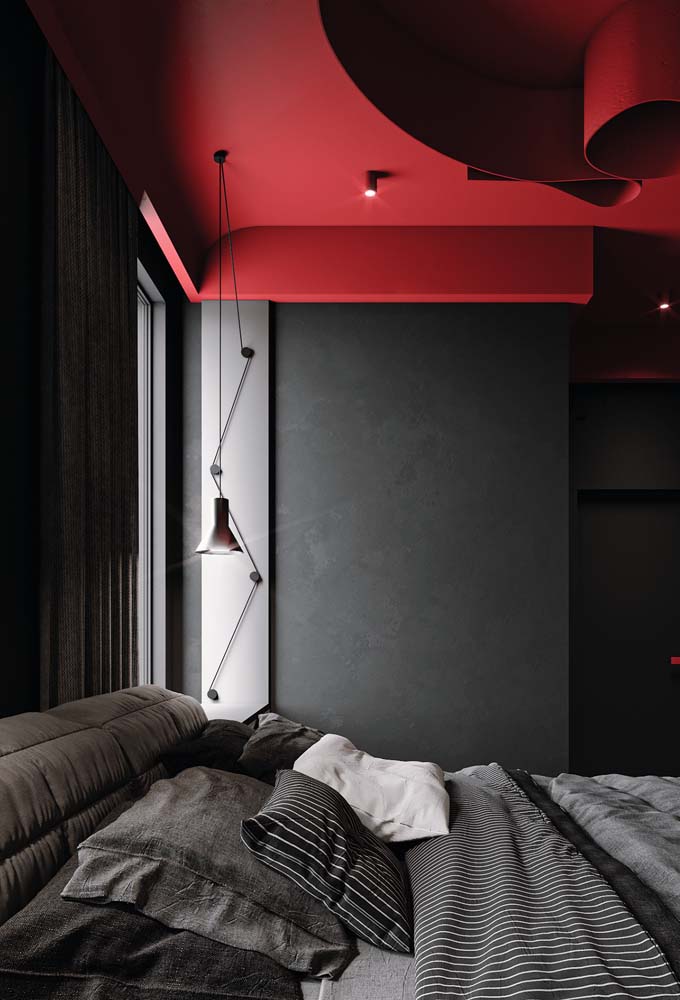 Imagem 36 – Teto vermelho e paredes pretas. Uma paleta de cores de tinta para quarto para quem deseja ousar.