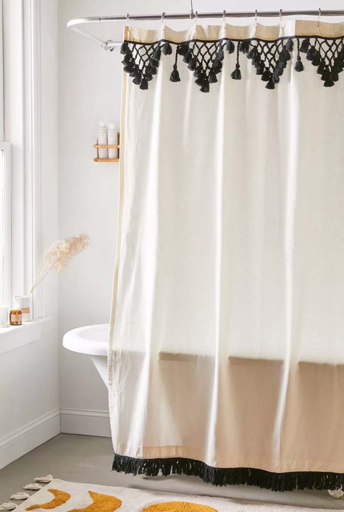Imagem 42 – Você pode fazer barrados e detalhes para valorizar o design de uma cortina simples para box.