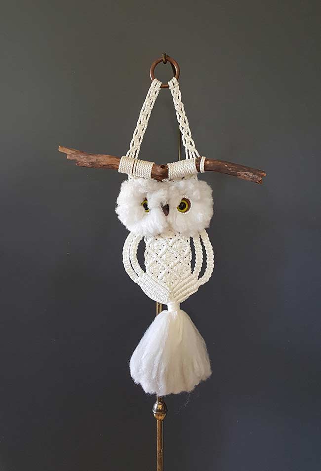 Mantas tapeçarias com coruja de crochê para pendurar na parede.