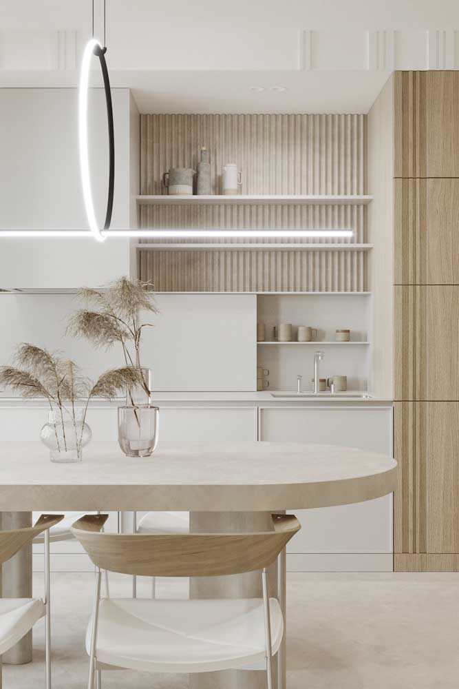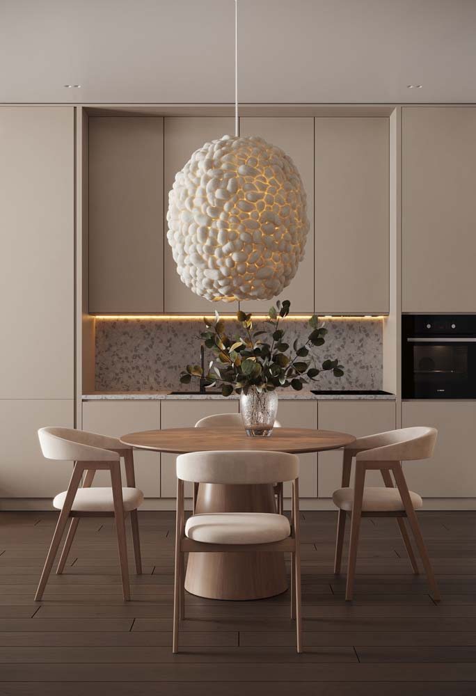 Além das áreas maiores da cozinha, o bege ainda pode ser inserido em detalhes, como luminárias, utensílios e louças, bem como objetos decorativos em geral.