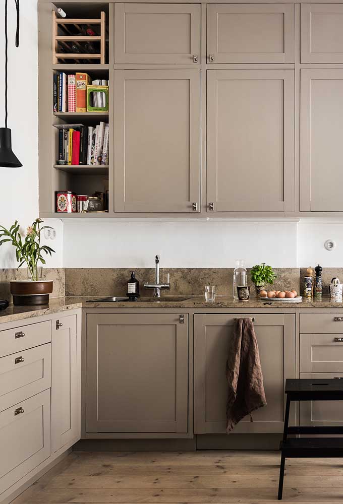 Experimente, por exemplo, usar o cinza na bancada da pia, enquanto o bege colore o piso, as paredes e os armários.