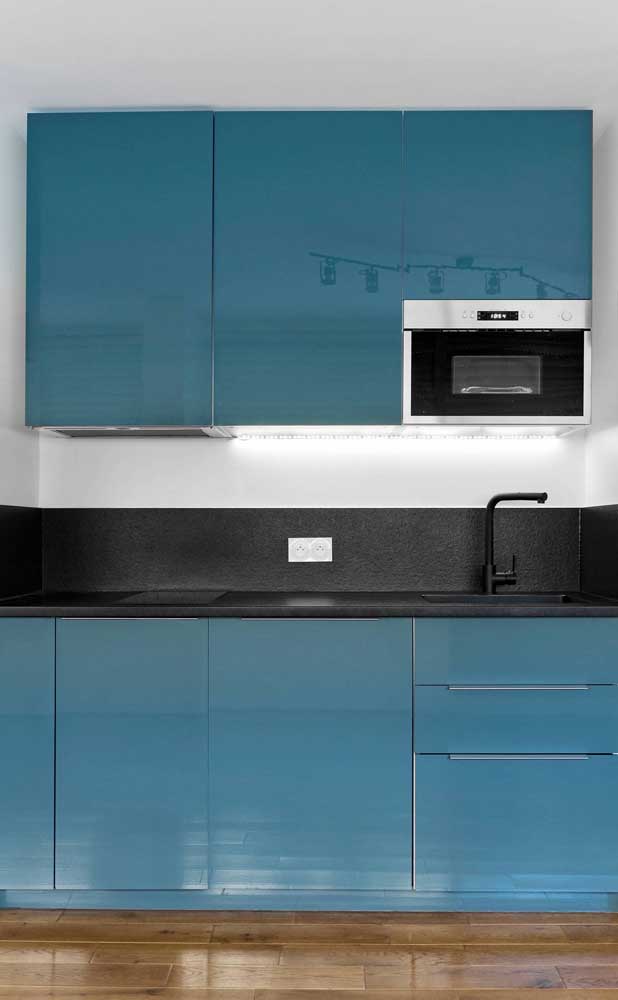 Imagem 42 – Que tal sair do comum e apostar em armários azuis para sua cozinha compacta?