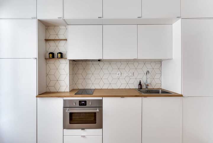 Imagem 13 – Cozinha compacta branca de apartamento; repare que foi usado apenas uma faixa de revestimento cerâmico na parede para não sobrecarregar o espaço.