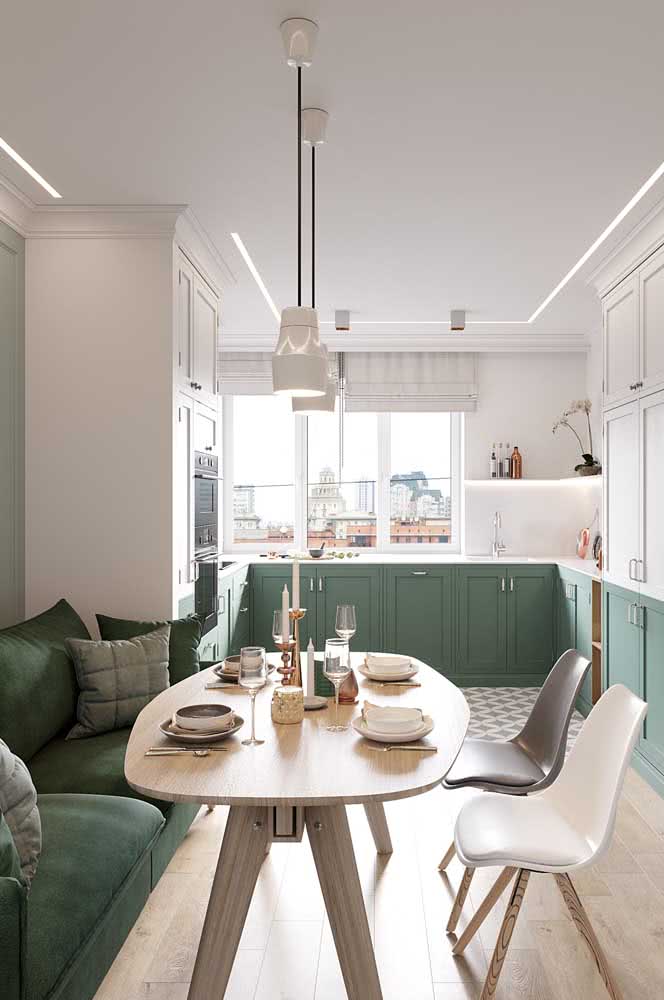 Se a cozinha for bem iluminada naturalmente, vale investir em cores mais escuras em uma das paredes principais, seja nos armários ou na própria pintura ou revestimento da parede.