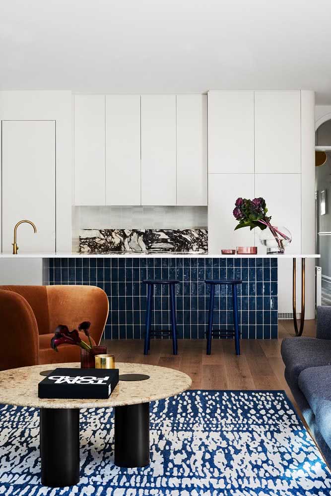 Imagem 22 – Já aqui, a ideia foi demarcar a cozinha conceito aberto com uma faixa de ladrilho hidráulico no piso.