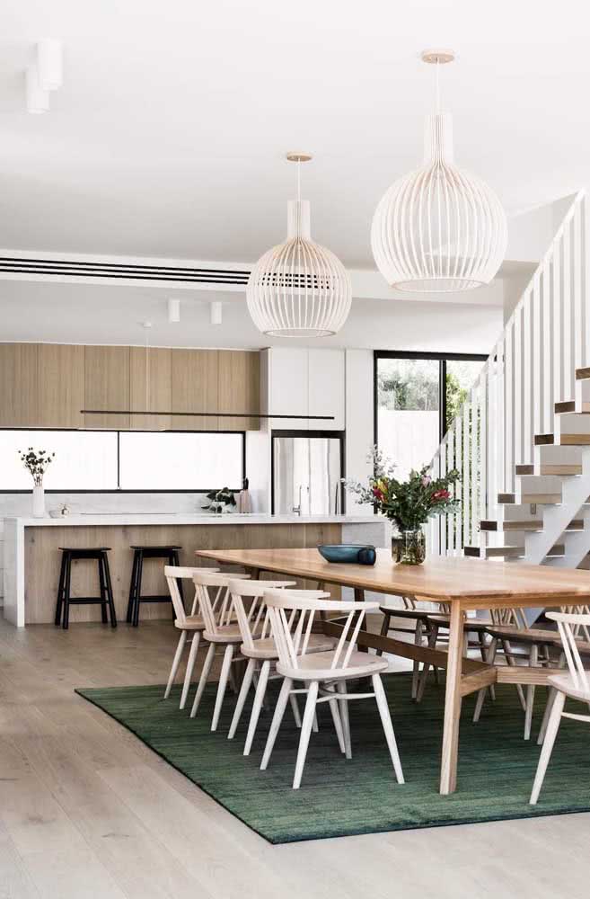Imagem 11 – Cozinha conceito aberto com sala de jantar. Repare que o piso de madeira acompanha os dois ambientes.