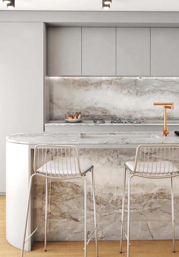 Imagem 54 – Projeto com ilha central revestida em pedra branca para refeição.