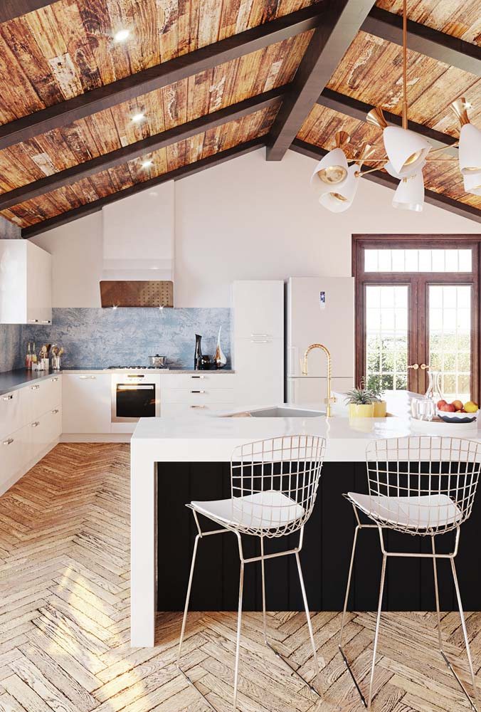 Imagem 86 – Essa cozinha conseguiu mesclar os materiais de forma moderna e harmônica.
