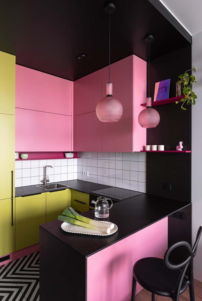 Imagem 32 – Funky e divertida com verde, rosa e preto nos armários.