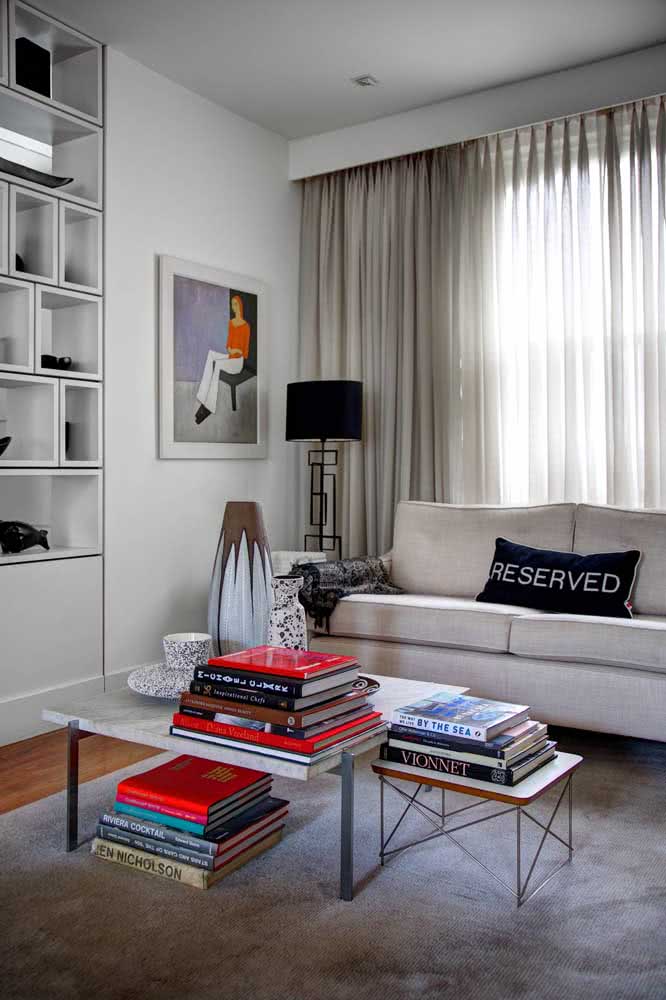 Imagem 16 – A mesa de centro é ótima para decorar com livros. Organize-os por cor e formato.