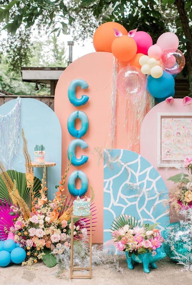 Na hora de planejar a decoração do painel considere usar tecidos, balões, flores, enfeites de papel, guirlandas ou até mesmo fotos. Lembrando que o painel também deve estar em equilíbrio com a paleta de cores e o tema da festa.