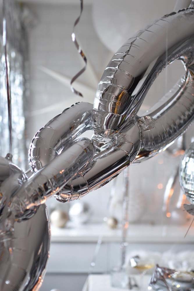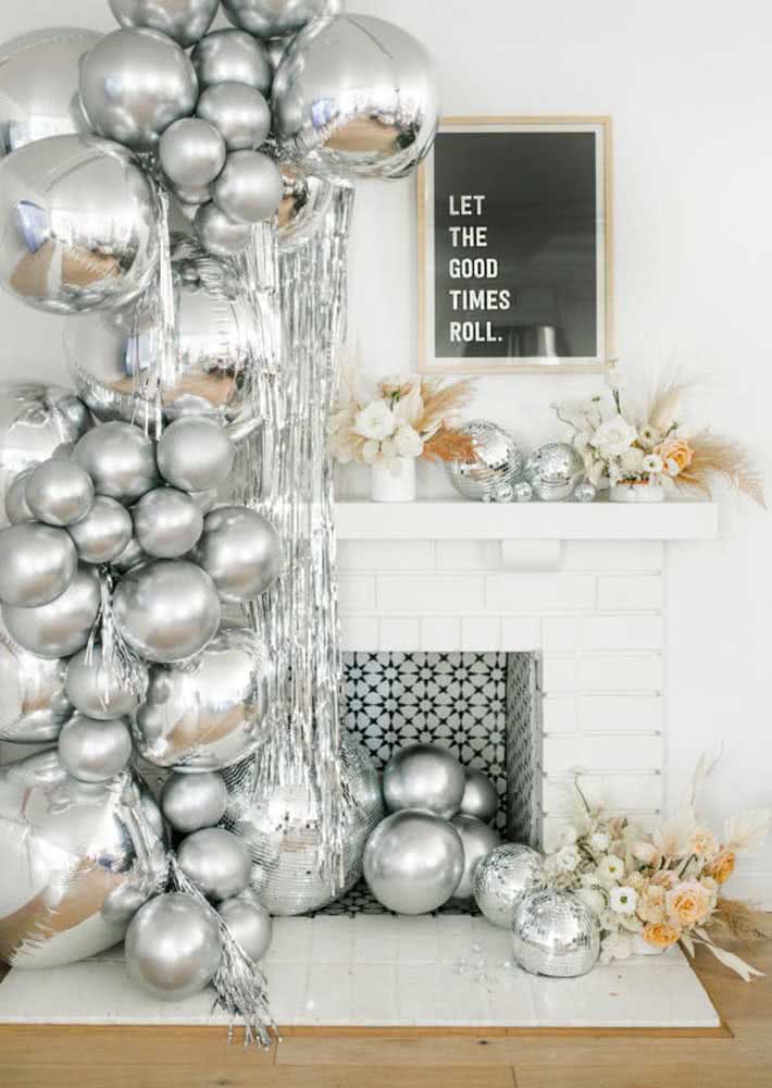 E se você quiser dar um toque mais clean para a decoração de Ano Novo, experimente usar balões transparentes com papel laminado dentro para criar um efeito levemente brilhante.
